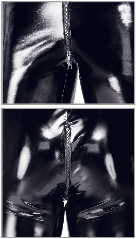 Schwarz-glänzender Lack-Overall mit kurzem Arm und Bein. Leicht elastisch für anschmiegsamen Komfort-Sitz. Mit unterlegtem 3-Wege-Reißverschluss vom markanten Stehkragen durch den Schritt bis über den Po.