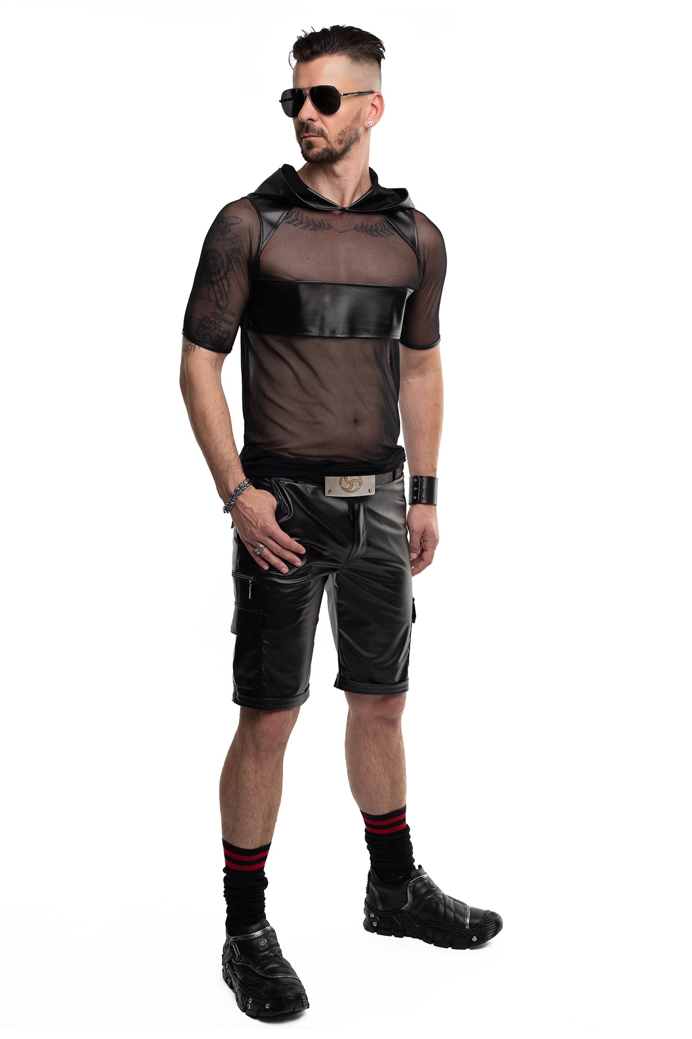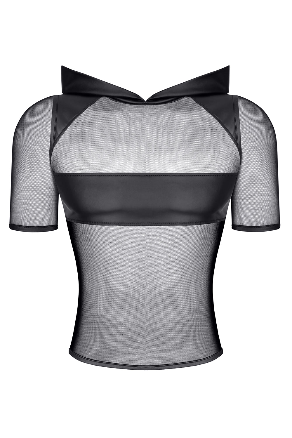 Dieses T-Shirt ist aus weichem, dehnbarem, schwarzem Mesh gefertigt. Einsätze in Wet-Look-Optik an Schultern und Brust sorgen für einen markanten Kontrast und verleihen dem Oberteil einen einzigartigen Charakter. Das transparente Material setzt Ihre Figur, Tattoos oder Piercings gekonnt in Szene. Die weite Kapuze in Wet-Look-Optik verleiht dem Shirt einen zusätzlichen Hingucker. Passt perfekt zu den Shorts RMPaolo