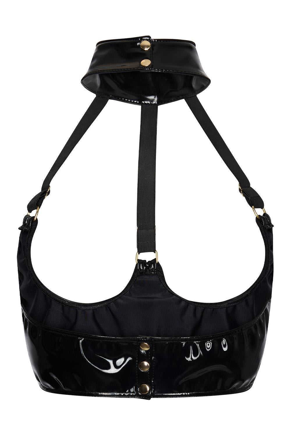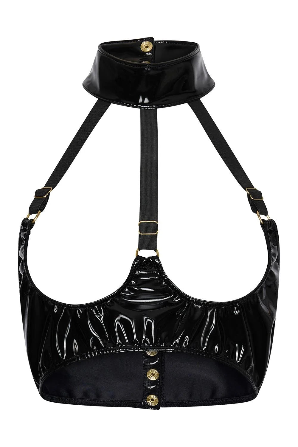 Ein weicher Choker-Ausschnitt sorgt für Drama und Kontrolle und lenkt den Blick nach oben, während goldfarbene Metallteile einen raffinierten Hauch von Luxus verleihen. Vollständig verstellbare Träger ermöglichen eine individuelle Passform und sorgen dafür, dass sich dieses provokante Stück genauso kraftvoll anfühlt, wie es aussieht.